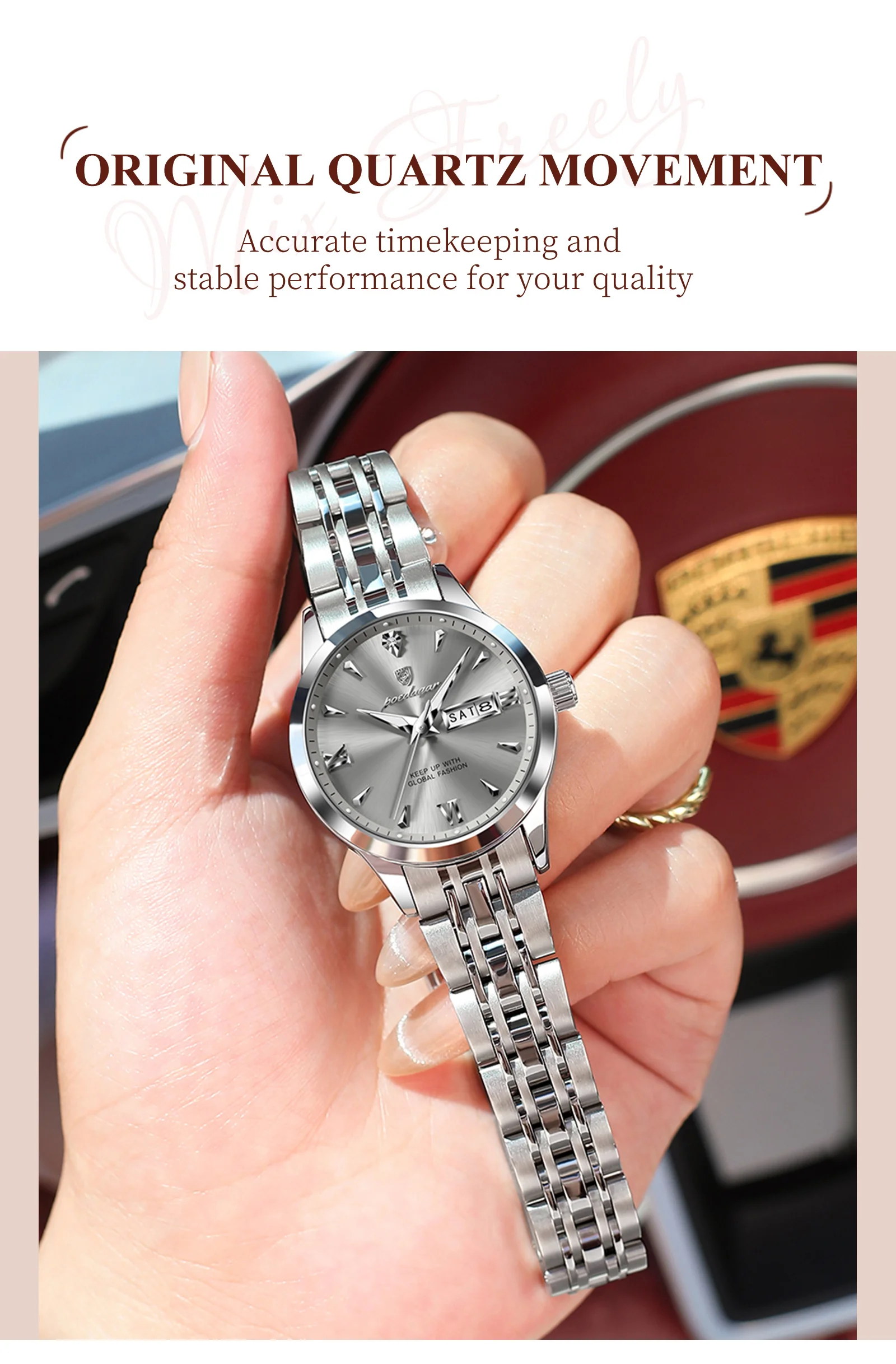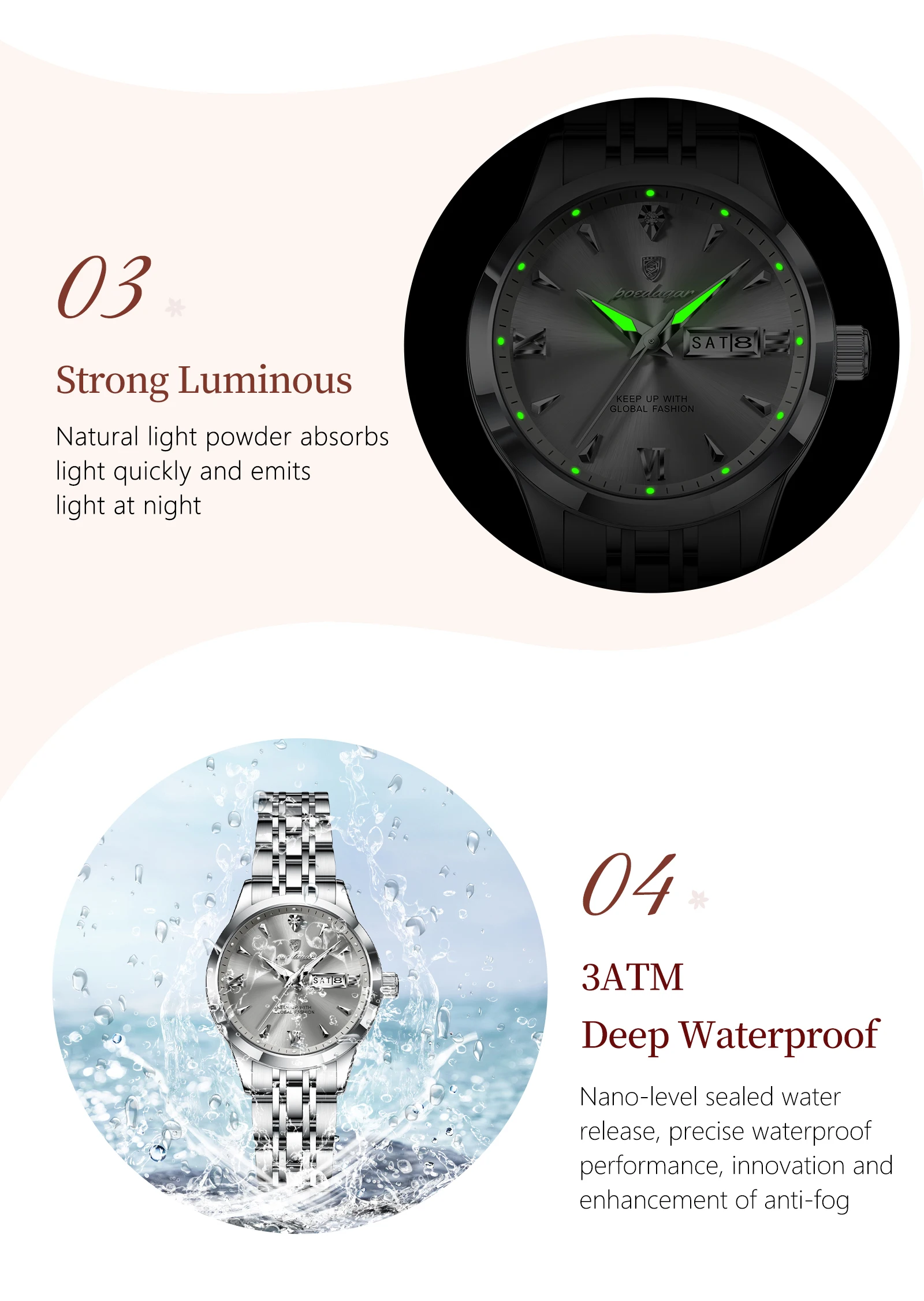 • Feature: Luminous,Auto Date,Water-Resistance,swim,Week Display,Luminous Hands